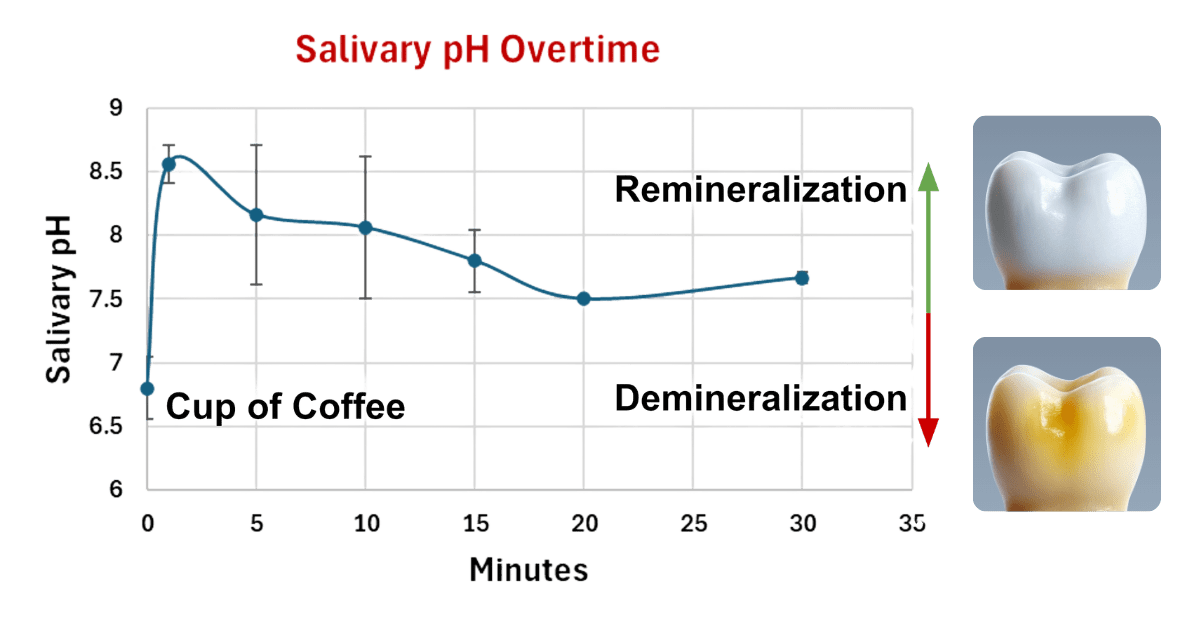 This graph shows how quickly saliva’s pH can drop after a cup of coffee, putting teeth at risk of demineralization and enamel erosion.